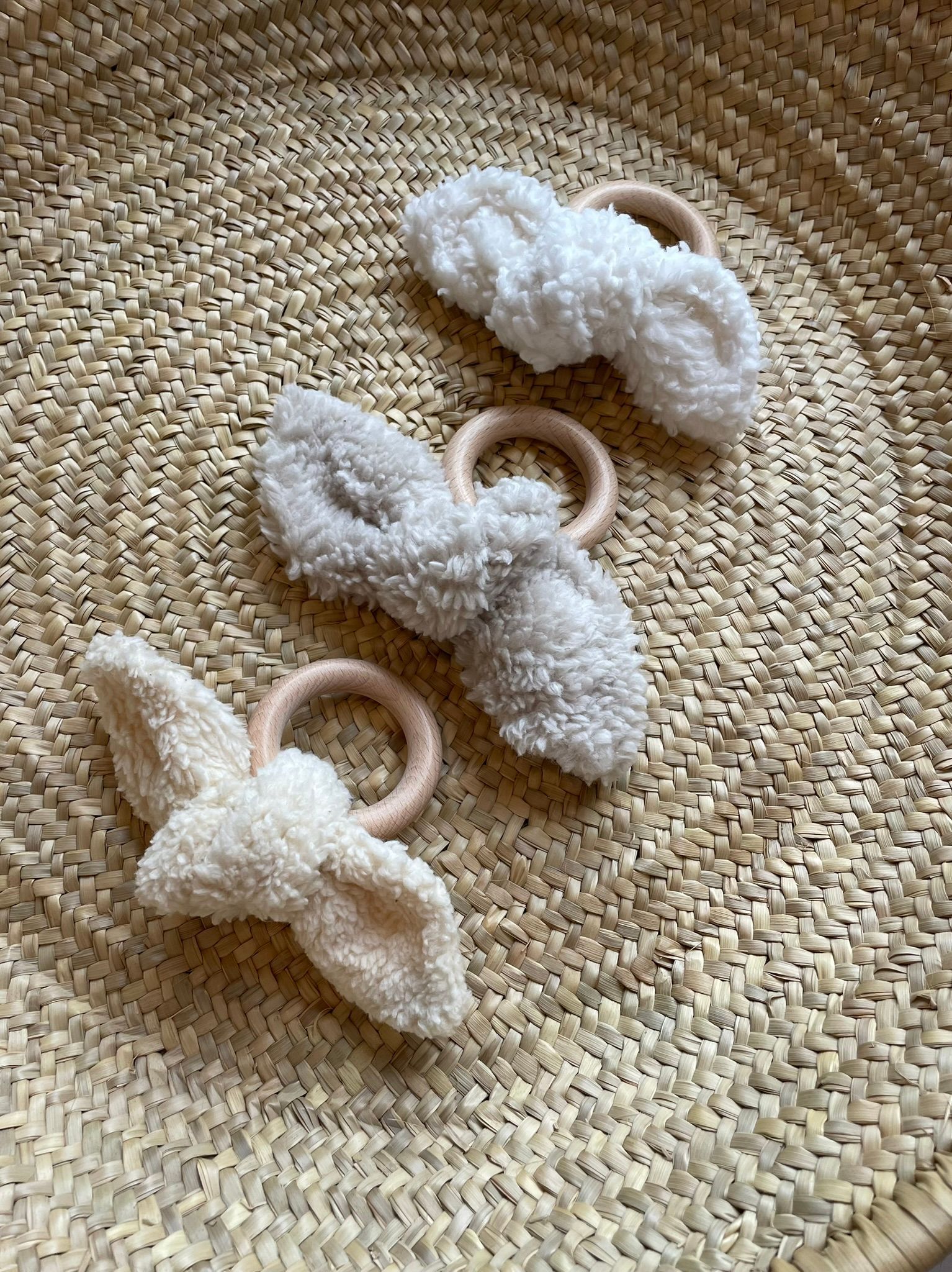 Katoen teddy strik bevestigd aan een bijtring. Voor urenlang speelplezier en het verkennen van de zintuigen.Voelen en bijten, kortom sensorisch babyspeelgoed.