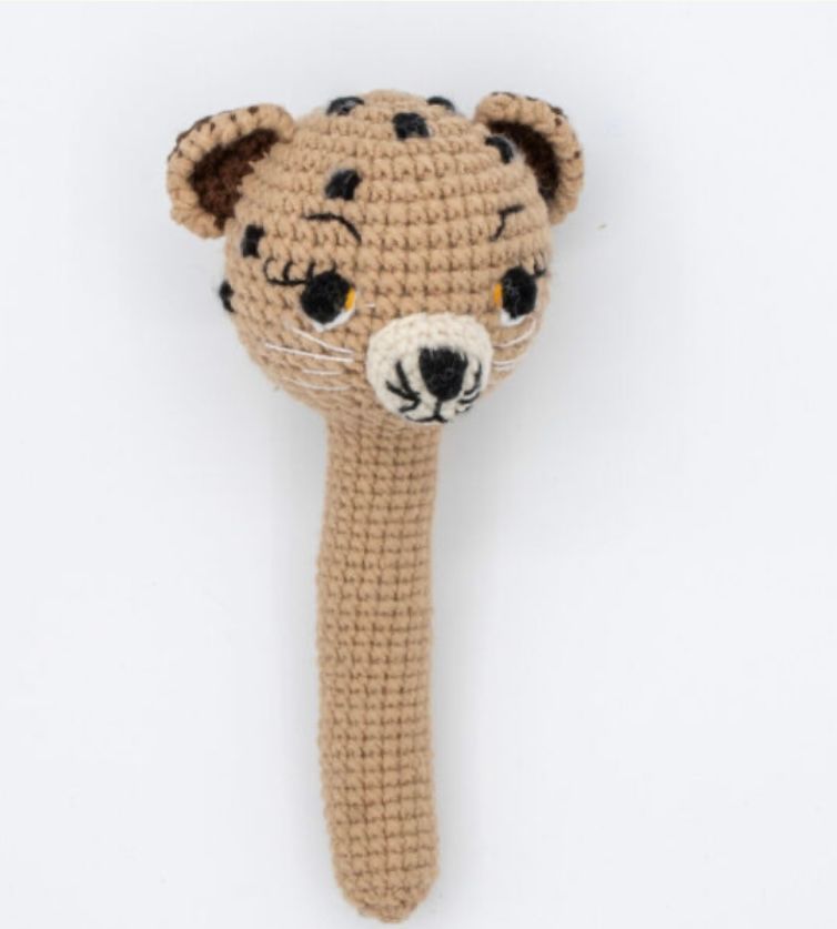 Deze gehaakte leopard rammelaar (12 cm) is een echte blikvanger in iedere babycollectie. Met zijn speelse uitstraling en zachte afwerking is hij perfect om mee te spelen, vast te houden en neer te zetten als decoratief item in de babykamer.