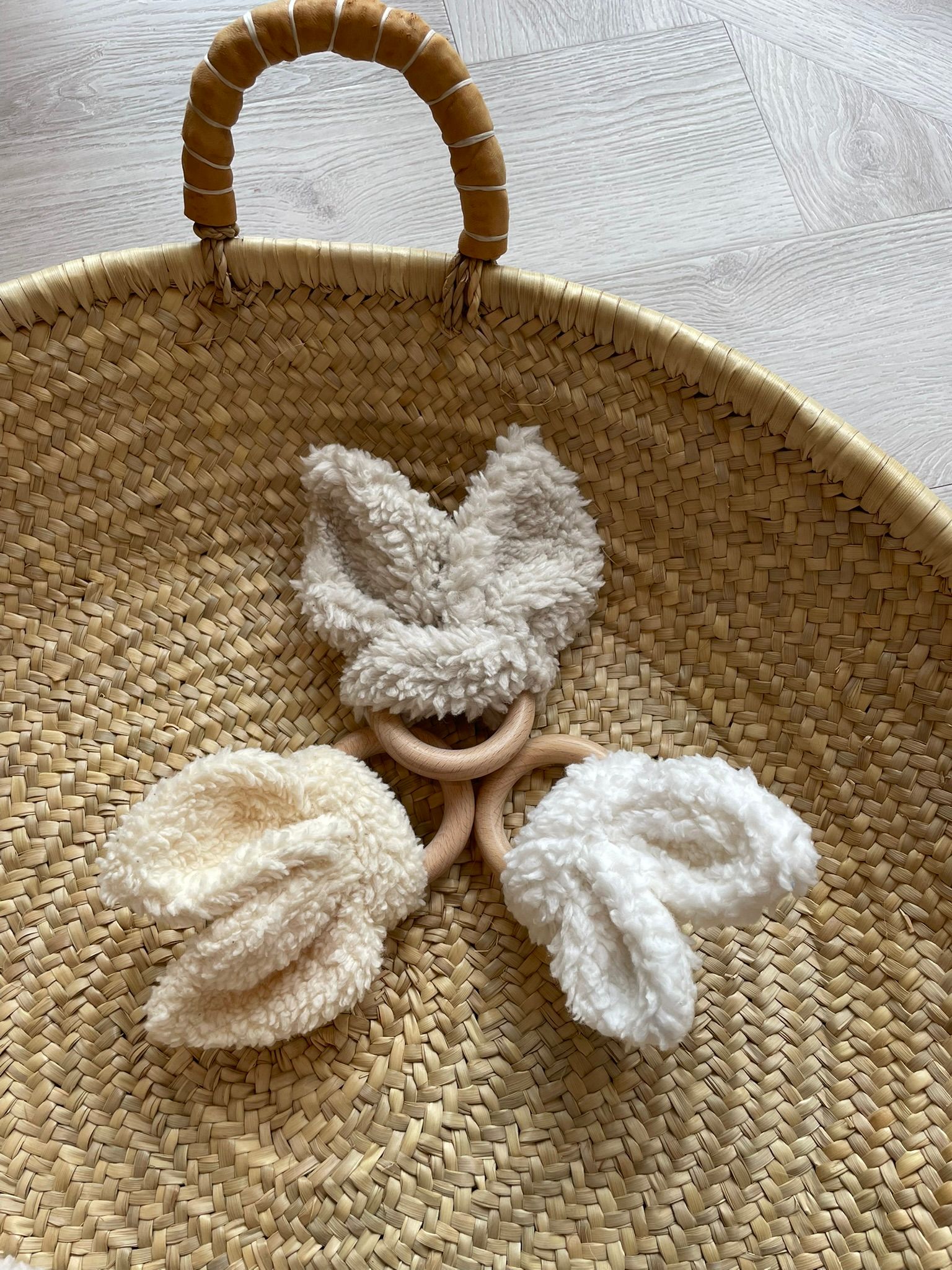 Katoen teddy oortjes bevestigd aan een bijtring. Voor urenlang speelplezier en het verkennen van de zintuigen.Voelen en bijten, kortom sensorisch babyspeelgoed.