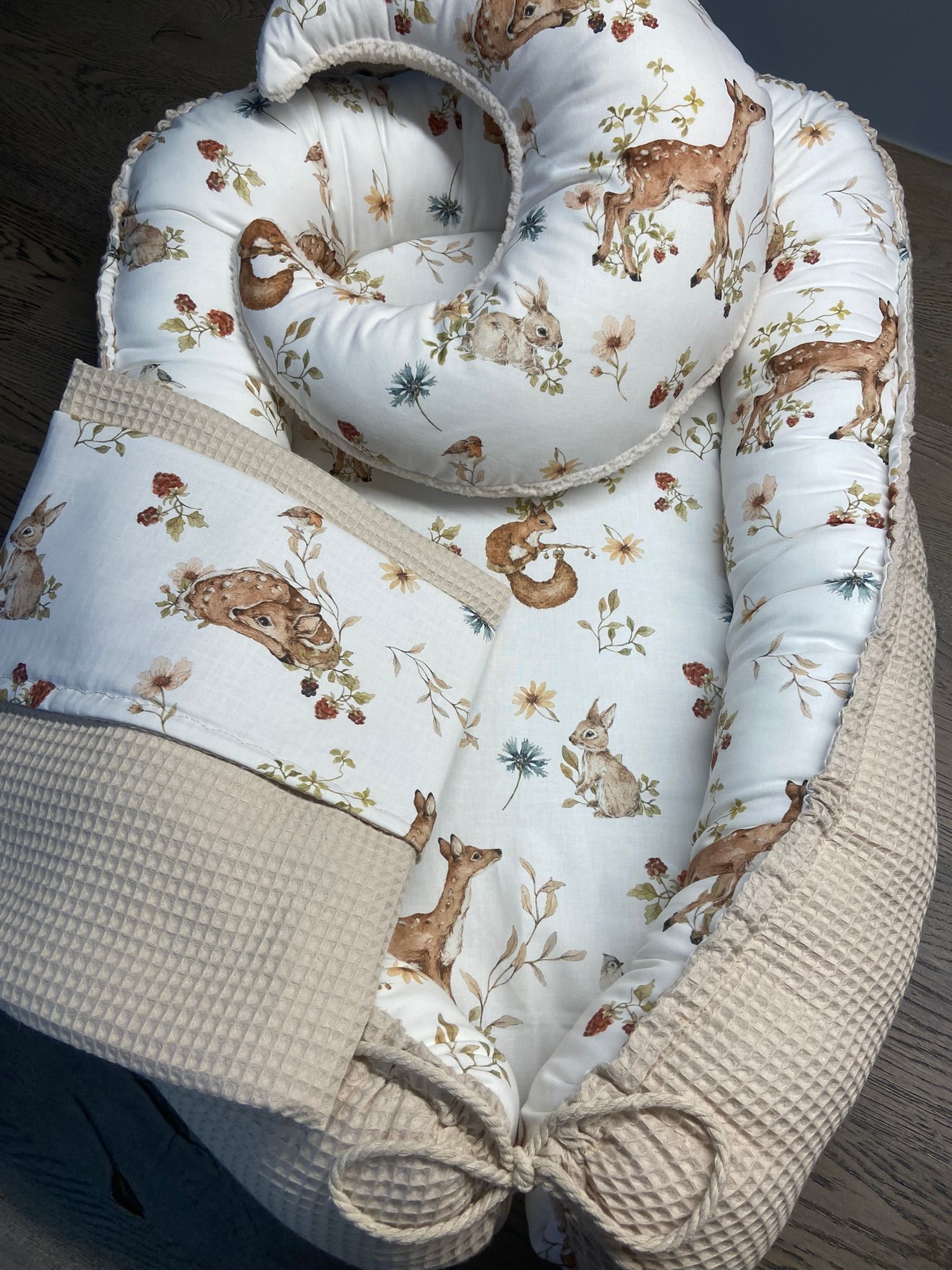 Stoffen 100% katoen poplin met woodland print en 100% katoen wafelkatoen.Describe the item or answer the question so that site visitors who are interested get more information. You can emphasize this text with bullets, italics or bold, and add links.