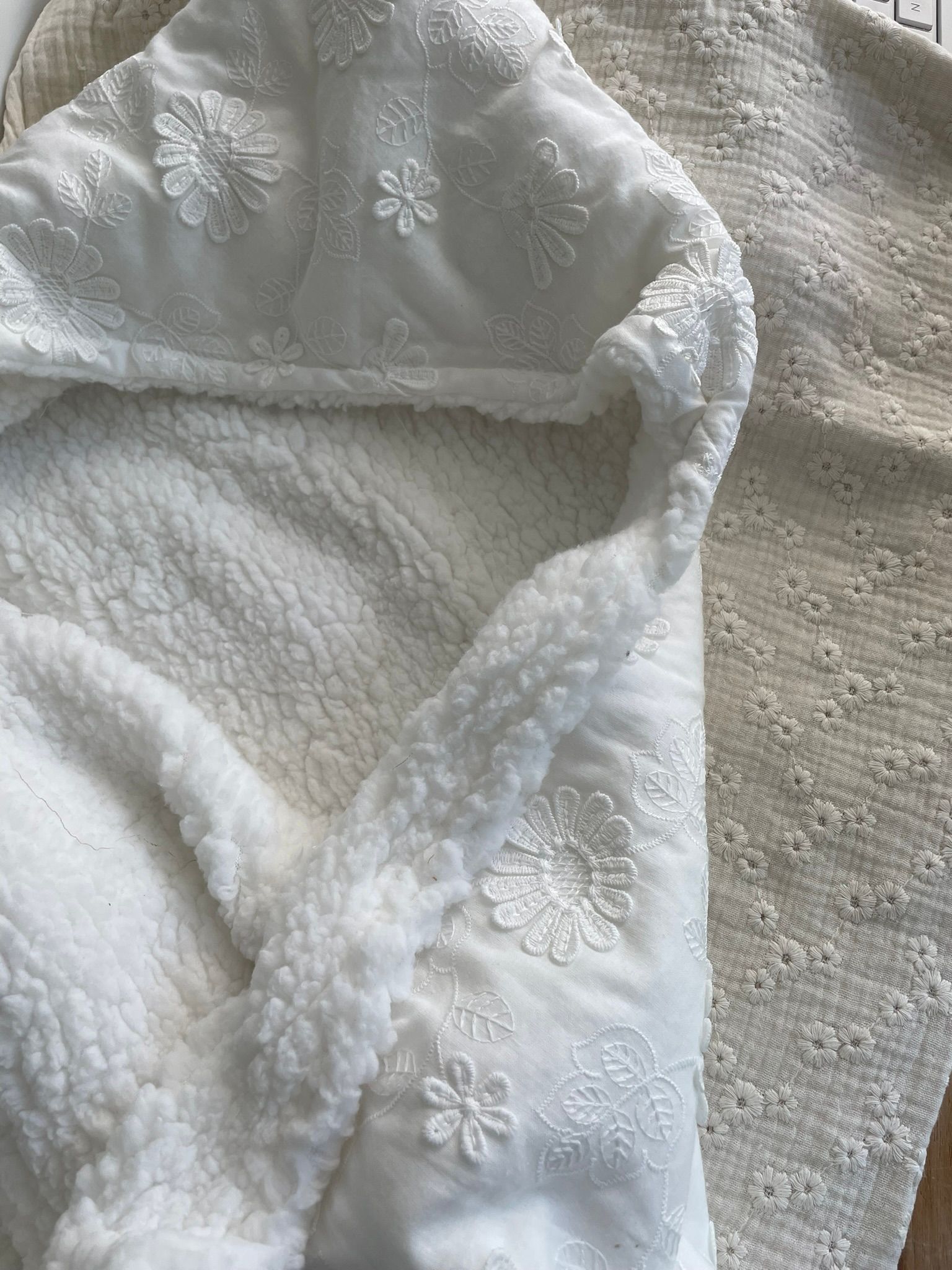 100% katoen 3D bloemengecombineerd met 100% polyester teddy.
