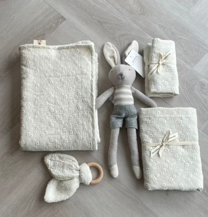 Het dekentje en de bijtring is gemaakt van hydrofiele stof van 100% katoen gecombineerd met 100% polyester teddy naturel.
