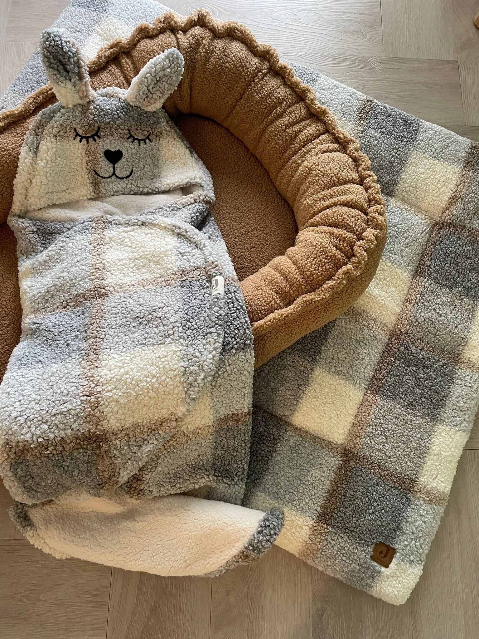 Wikkeldeken met gegarandeerd mega hoge cutenessfactor. De grove bouclé stof aan de buitenkant matcht perfect met het Check bouclé boxkleed. Aan de binnenkant zit een heerlijke coral fleece stof. Wikkel je baby in deze omslagdoek en sluit de deken met de praktische klittenbandstroken. Zet het mutsje erbij op en zie daar, die schattige oortjes en dito konijnengezichtje op het mutsje. Echt te lief! Deze omslagdoek is te gebruiken vanaf de geboorte. En ook heel handig te gebruiken in baby’s eerste autostoel. Kom in scandinavische sferen met de mooie koele kleurtjes en de leuke ruitprint!